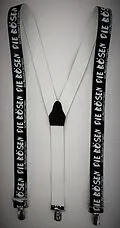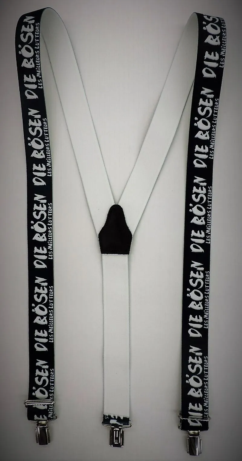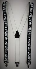 Hosenträger schwarz 36 mm breit weiss bedruckt mit Bösen-Logos 3 Clips mit Leder Endstück Material: 85% Polyester 15% Elasthan Lieferung nur solange Vorrat!
