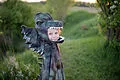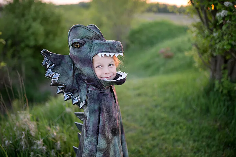 Dieser grün, grau und lila batikgefärbte Umhang ist mit einem schwarzen Futter versehen. Er ist mit grauen und lila metallischen Stacheln auf dem Rücken verziert. Der Dinosaurierkopf hat ein abnehmbares Mundstück für einen sicheren Sitz. Dieses Set besteht aus...