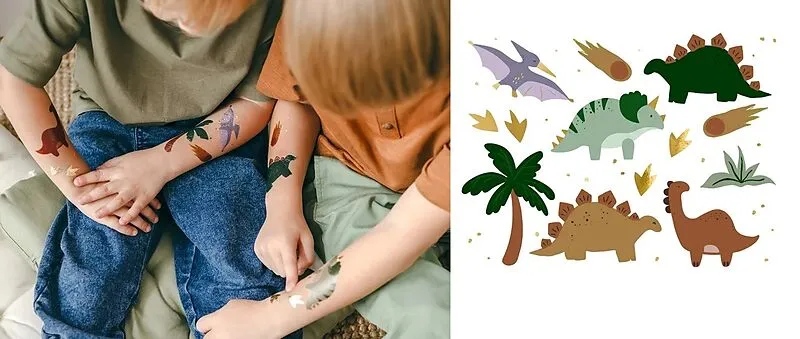 Abwaschbare Tattoos Dinosaurier, Mischung aus Motive und Farben, Set enthält 13 Motive.