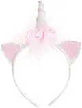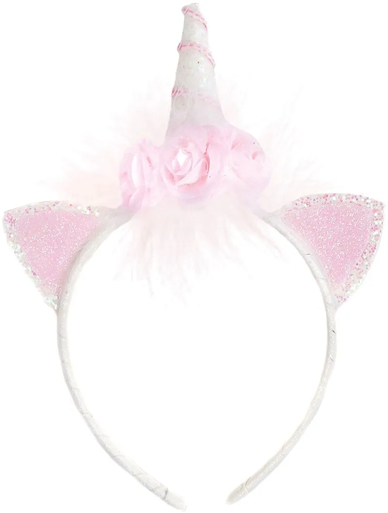 Dieses lustige rosa-weiße Einhorn-Stirnband ist genau das, was Sie brauchen, um jeden Einhorn-Look zu vervollständigen. Funkelnde glitzernde rosa Ohren, weicher Marabu-Besatz und rosa Rosen sind an einem magischen Einhornhorn mit rosa Paillettendetails befesti...