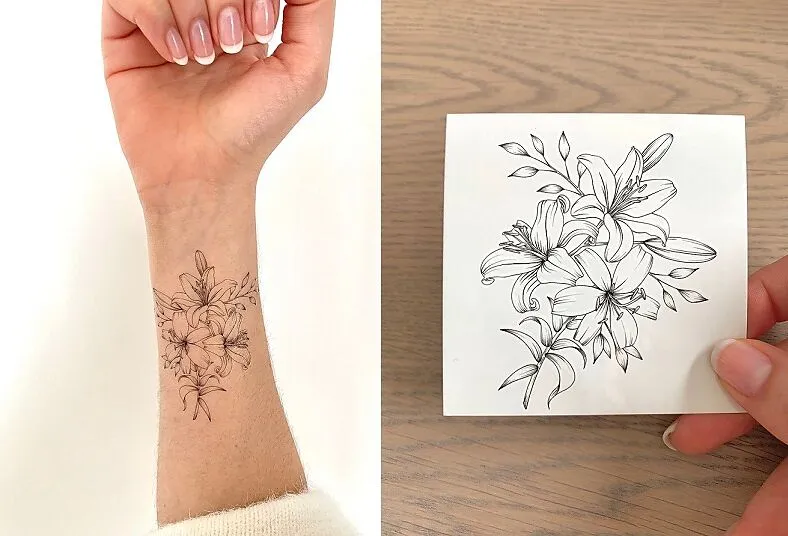 Größe: ca. 7,5 cm Wunderschönes Blumentattoo Hält ca. 2-7 Tage, hängt davon ab, wo das Tattoo aufgesetzt wird und wie nass es wird. Eine Gebrauchsanleitung liegt bei. Das Tattoo kann mit Öl entfernt werden.