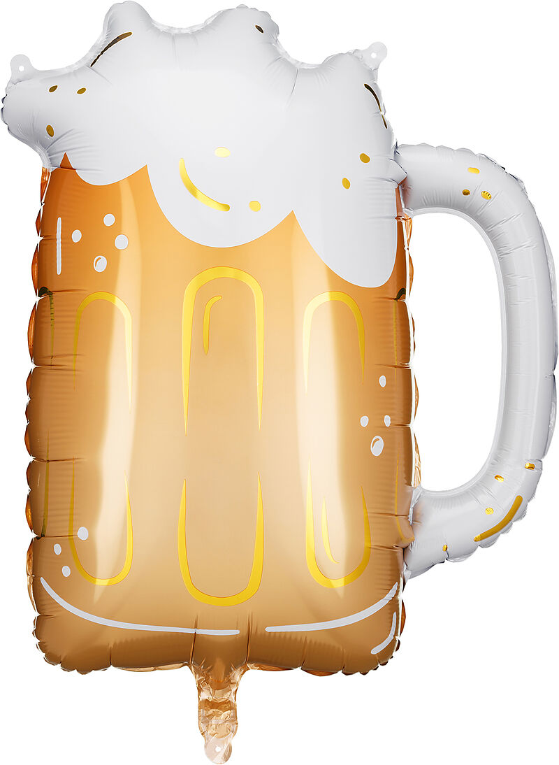 Folienballon in Form eines Bierkrugs, ca. Abmessungen 66 x 54 cm. Zum Aufblasen mit Luft und Helium. Enthält einen Strohhalm.