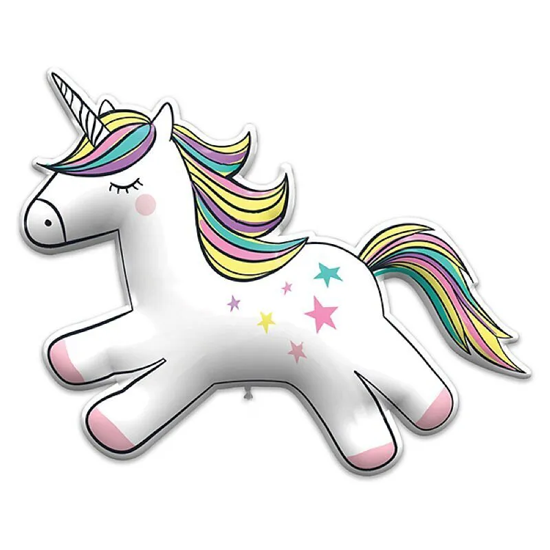 Folienballon Einhorn. Ein strapazierfähiger Folienballon mit einem selbstschliessenden Automatikventil. Der Ballon hat ein Patentventil eingebaut und kann mehrfach aufgeblasen werden.