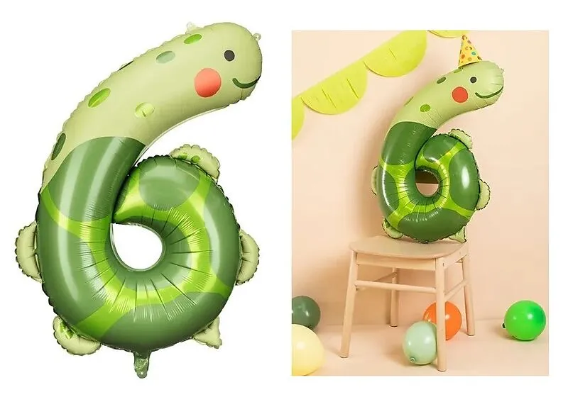 Folienballon Ziffer 6 - Schildkröte, Farbenmix, Abmessungen: vor dem Aufblasen ca. 75 x 96 cm (29.5 x 37.5''), Höhe nach dem Aufblasen ca. 57 x 86 cm (22.5 x 34''). Kann mit Helium oder Luft aufgeblasen werden. Zum Set gehört ein Strohhalm.