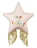 Folienballon Stern mit Fransen Happy Birthday, Farbmix. Maße vor dem Aufblasen: ca. 79.5 x 76.5 cm (31.3 x 30.1''), Maße nach dem Aufblasen: ca. 72 x 72 cm (28.3 x 28.3''). Zum Aufblasen mit Luft und Helium. Das Set enthält einen Strohhalm.
