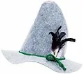 Grauer Filzhut, der mit einem Hutband aus grüner Kordel und Dekofedern verziert ist. Einheitsgrösse