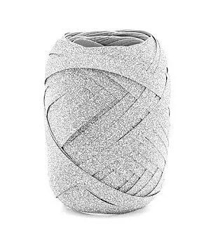 Glitzerndes Kunststoffband in Silber, ca. 5 mm breit, ca. 10 m lang.