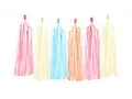 Länge Quasten: 30 cmLänge Girlande: 1.5 mInhalt: 2 Meter weisses Garn, 12 Quasten in den Farben Creme, Rosa, Blau und Lachs (je 3 Stück)