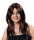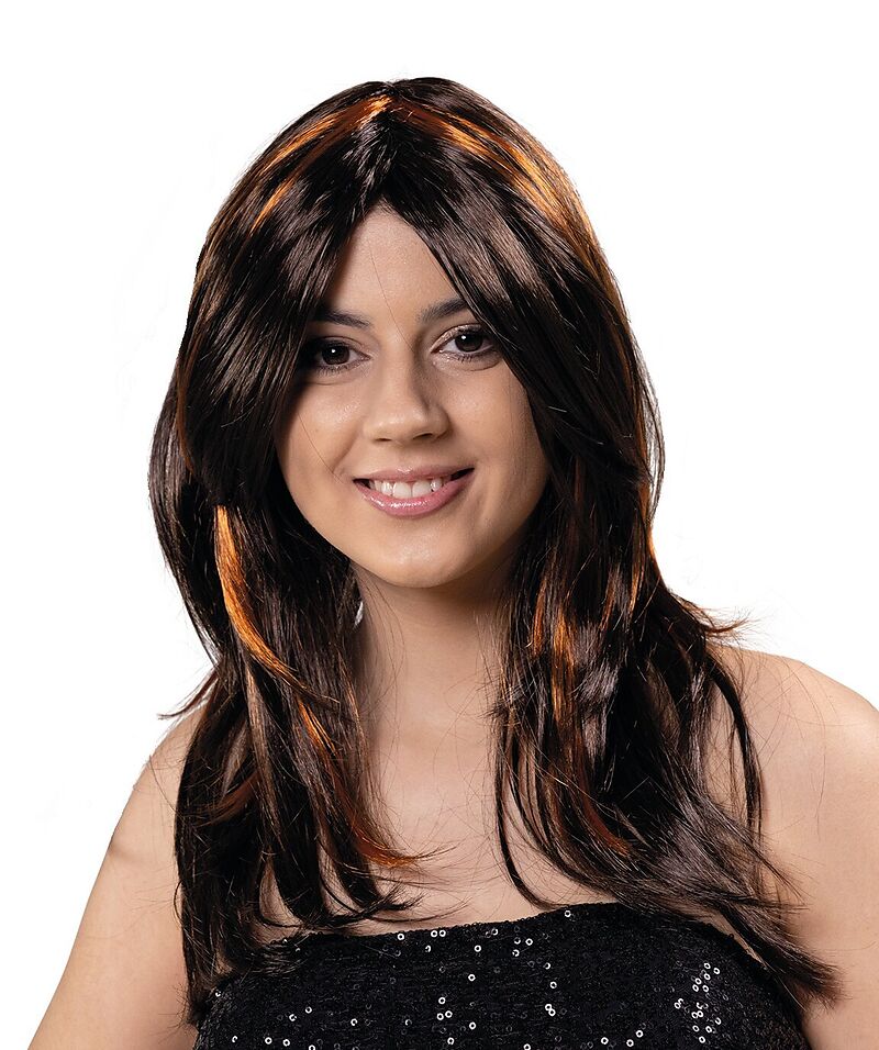 Leicht gestufte Langhaarperücke mit hellbraunen Strähnen, mittig gescheitelt. Die Haare fallen bis über die Schultern. 100% Polyester