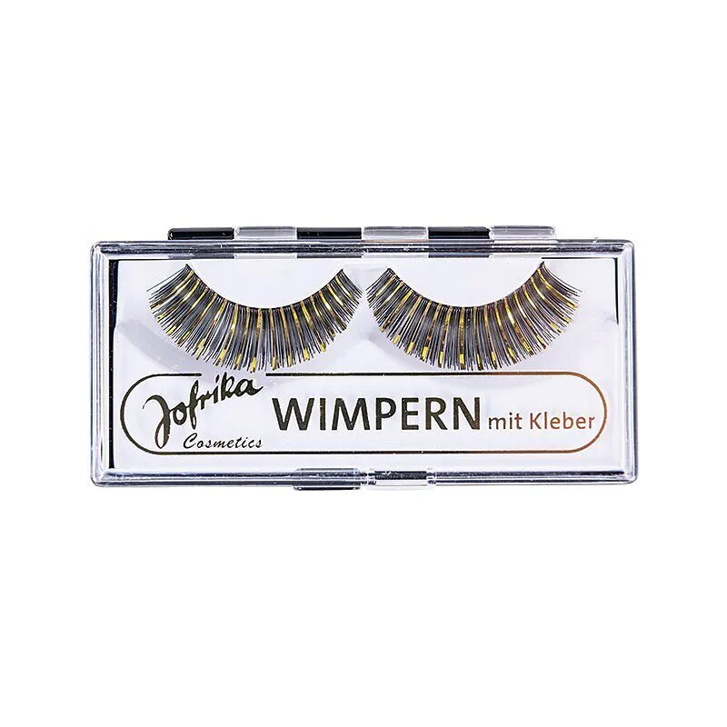 Künstliche Wimpern mit einem glänzenden goldenen Glittereffekt. Inklusive des Wimpernklebers.
