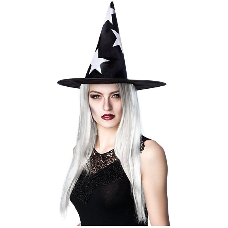 Hexenhut mit weissen Haaren mit Sternenmuster