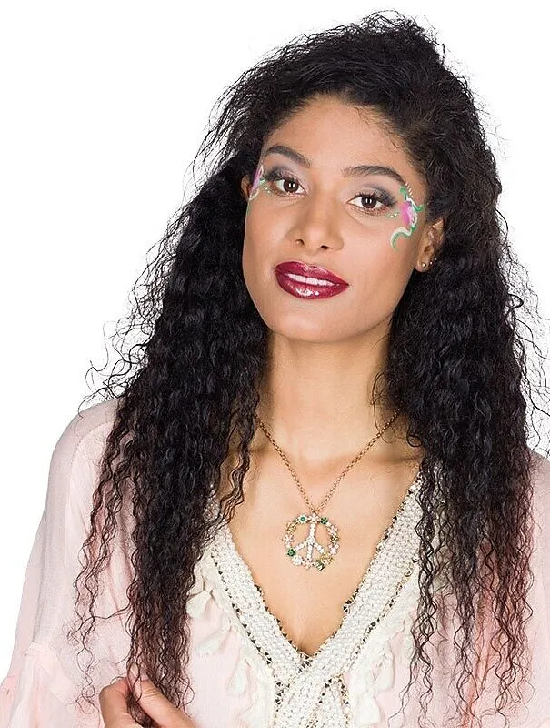 Halskette mit einem Peace-Zeichen, das mit Strasssteinen und kleinen Blüten aus bunten Schmucksteinen besetzt ist.Ein Must-have für jeden Hippie.