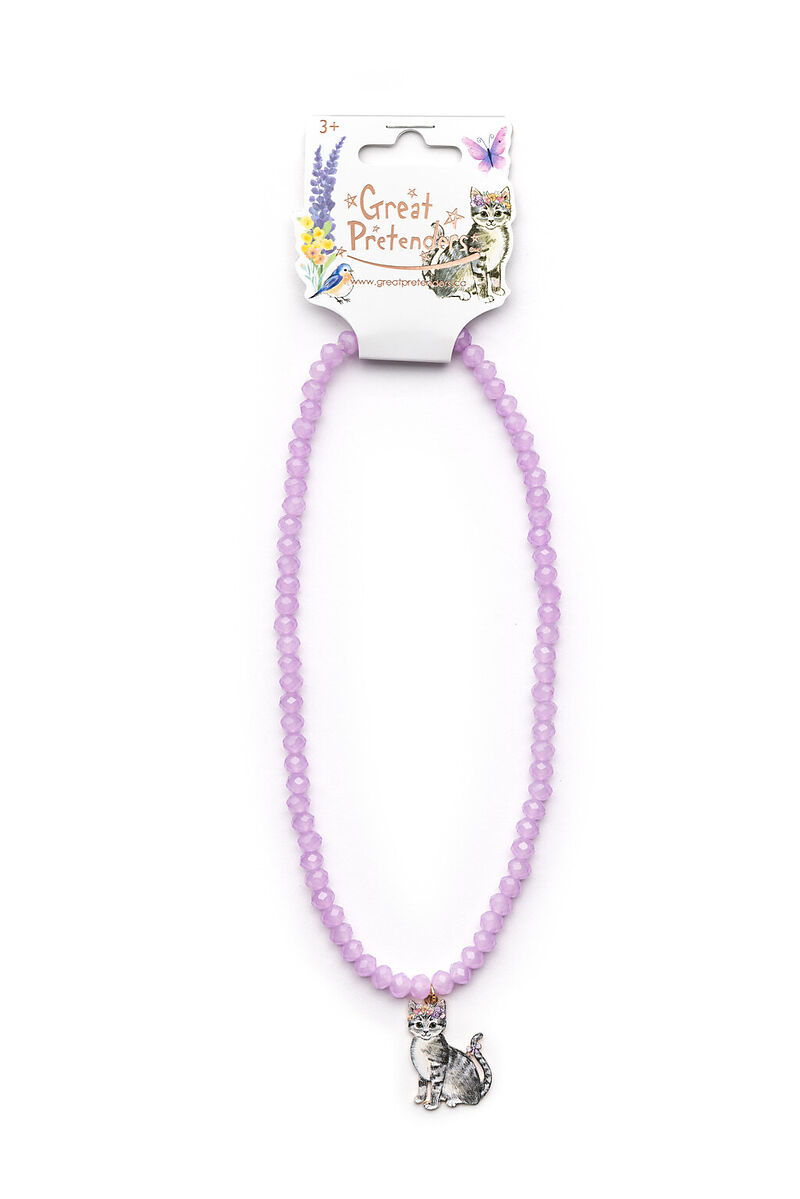 Die Halskette besteht aus einer Reihe faszinierender, facettierter lila Perlen, die das Licht einfangen und ein magisches Farbenspiel erzeugen. Der wahre Star der Halskette ist der handbemalte Kätzchen- Anhänger, der diesem Schmuckstück eine künstlerische und ...
