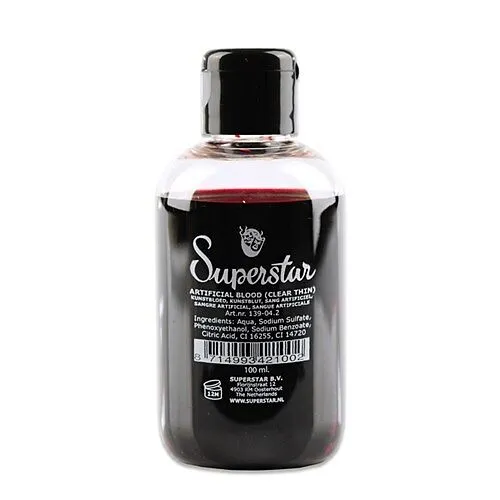 Künstliches Blut klar dünn 100ml. Eventuelle Flecken auf der Kleidung zuerst mit lauwarmem Wasser abspülen, dann in der Waschmaschine waschen. Waschbar mit Wasser und Seife. Perfekt für Halloween!