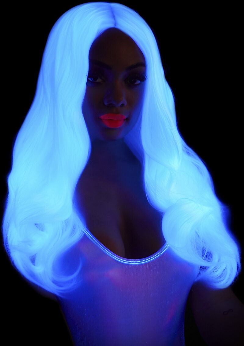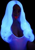 Grösse: einstellbar Matrial: 100% Polyester INFO: Die Perücke leuchtet unter Schwarzlicht/UV-Licht! Wunderschöne sehr echt wirkende Kusthaarperücke mit langem, gewelltem, weissem Haar.