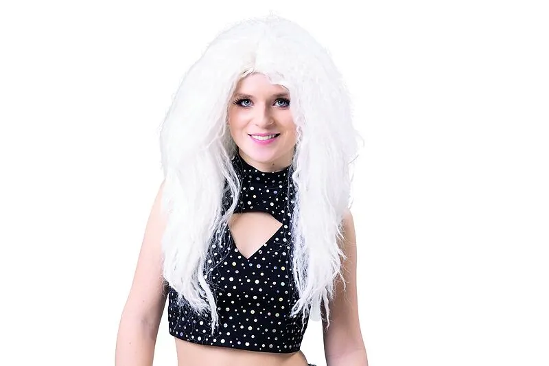 Weiße, gekreppte Langhaarperücke, mittig gescheitelt. Eignet sich für Disco-Outfits genauso wie für den Einsatz als Halloween-Geist oder als Engel. 100% Polyester