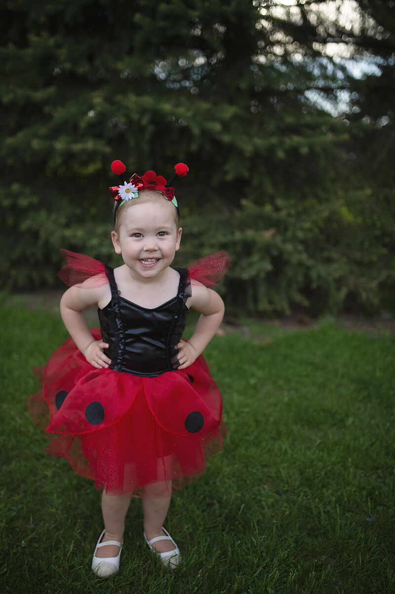 Das Kleid verfügt über ein schwarzes Oberteil mit einem roten Schmuckstein und einen roten Tüllrock mit schwarzen Punkten. Ebenfalls im Set enthalten ist ein Marienkäfer-Haarband mit Pom-Pom-Fühlern und garteninspirierten Designs. Lieferumfang: Kleid und Haarr...