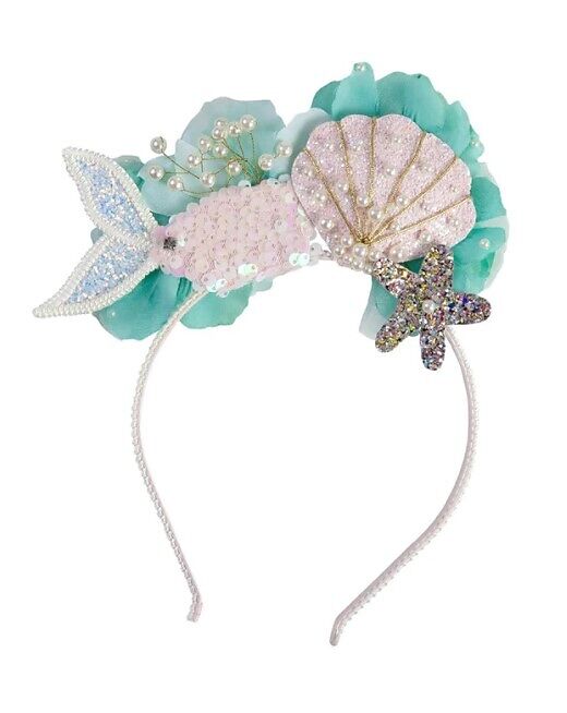 Das mit Perlen, Pailletten und Goldverzierungen besetzte Mermalicious Stirnband ist etwas ganz Besonderes! Es enthält ikonische Verzierungen aus Meerjungfrauenschwanz, Muschel, Seestern und Meeresperlen. Sie bestehen aus einer glitzernden 3D-Muschel, die mit P...