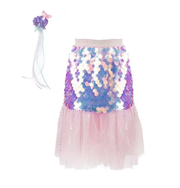 Tauche ein in eine funkelnde Unterwasserwelt mit diesem bezaubernden Meerjungfrauen-Set! Der Rock begeistert mit grossen, schimmernden Pailletten, träumerischem rosafarbenem Tüll und einem bequemen Bund in Pink. Abgerundet wird das Outfit durch eine passende H...