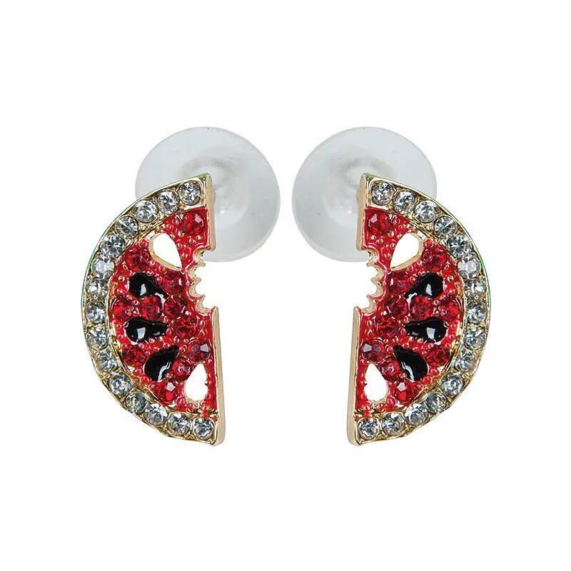 Ohrstecker in Form eines Melonenstücks. Die Ohrringe sind mit Strasssteinen besetzt.