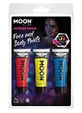 Farbe: rot, gelb, blau Inhalt: 3 x 12 ml Die Moon Glow Neon UV Face Paints scheinen tagsüber in auffälligen Neonfarben und nachts werden sie unter dem UV-Licht zum Leuchten gebracht. Made in the UK, 100% vegan, ohne Tierversuche, frei von Duftstoffen, Parabene...