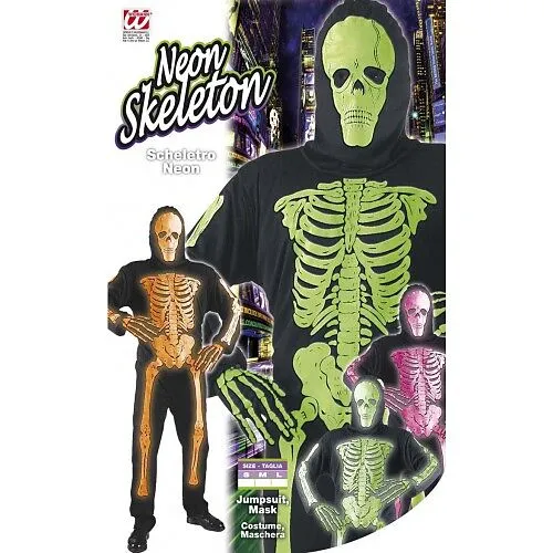 Lieferumfang: Overall mit Maske Grösse: M Verbreiten Sie für einmal Angst und Schrecken. Mit diesem schwarzen Ganzkörperanzug, welcher einen ausgefallenen und knalligen Skelettaufdruck in Grün, Orange oder Pink hat, ist es ganz einfach. Die modischen Neonfarbe...