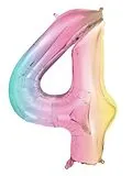 Folienballon in Form der Zahl ''4'' in Pastell-Regenbogenfarben, Größe vor dem Aufblasen ca. 100 cm (39''), nach dem Aufblasen ca. 86 cm (34''). Für Luft- und Heliumbefüllung geeignet. Röhrchen enthalten.