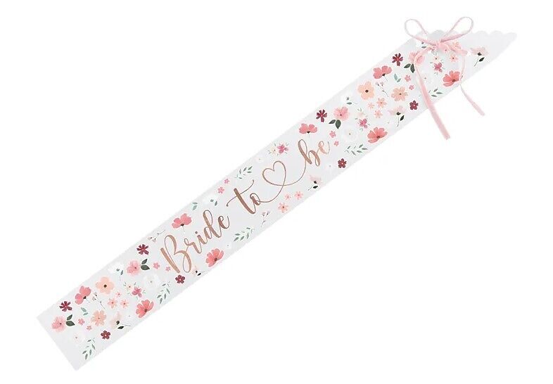 Papierschärpe Bride to be in Weiß mit buntem Druck und metallisiertem Schriftzug in Roségold, ca. 9,5 cm breit, ca. 76 cm lang.