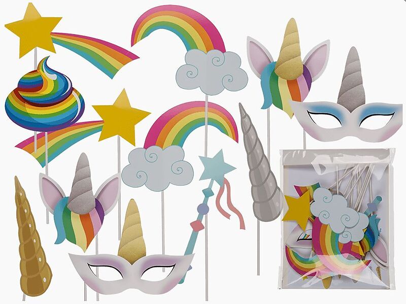 auf Stick Inhalt: Horn, Regenbogen, Brille mit Horn etc. 12er Set Achtung: Nicht für Kinder unter 3 Jahren geeignet. Erstickungsgefahr aufgrund verschluckbarer Kleinteile.