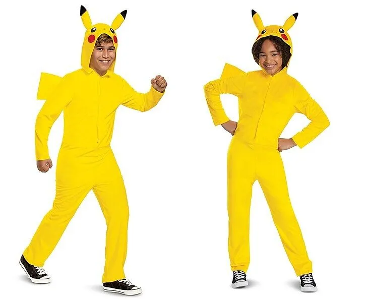 Pikachu Overall aus Kurzhaarplüsch mit Klettverschluss im Bauchbereich. Der Overall hat einen Schwanz und eine abnehmbare Kapuze mit Ohren und gesticktem Pikachu Gesicht. Größe XL = 14-16 Jahre