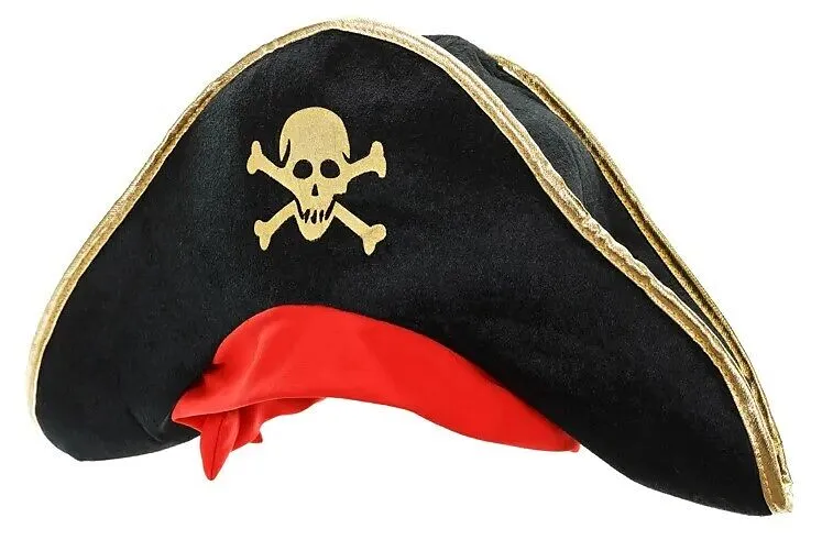 Piratenhut in Schwarz mit goldener Umrandung und rotem Band. Produktabmessungen: 42 x 20 x 9 cm, Kopfumfang: 45 cm