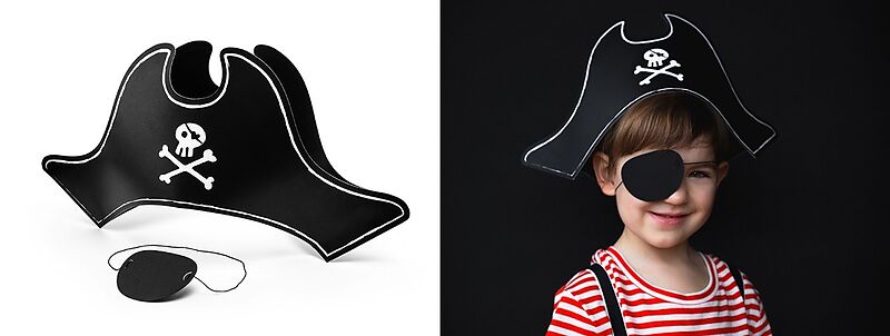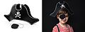 Piratenhut mit Augenklappe, aus schwarzem Papier mit weißem Druck, Maße des Hutes: Kopföffnung ca. 23 x 18 cm, Höhe ca. 14 cm, Maße der Augenklappe: 7 x 5,5 cm.