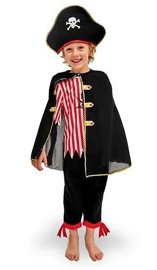 Piratenkostüm mit Umhang, Kinder, Größe 116-128 cm (5-8 Jahre). Das Set enthält schwarze Hosen mit roten Kanten, ein rot-weiß gestreiftes Shirt, einen schwarzen Umhang, der am Hals mit einem Knopf befestigt wird, und einen Piratenhut. Material: 100 % Polyester...