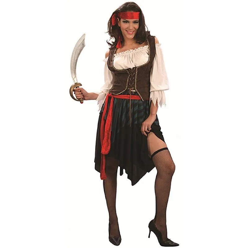 Kostüm Piratin Grösse 38. In diesem Kostüm mit Stirnband, Oberteil mit Gilet, Gurt und Rock, wirst du die Blicke auf dich ziehen.