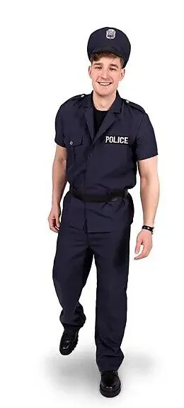 Polizistenkostüm für Erwachsene, Größe L. Das Kostüm ist marineblau. Das Hemd hat einen Klettverschluss. Das Set beinhaltet ein Hemd, eine Hose, eine Mütze und einen Gürtel. Material: 100% Polyester. Pflegehinweis: nur Handwäsche. Produktabmessungen: Hemd: Län...