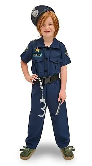 Polizeikostüm, Kinder, Größe 116-128 cm (5-8 Jahre). Das Kostüm ist navyblau mit goldenen Abzeichen. Das Set enthält eine Mütze, ein Hemd mit Knöpfen, eine Hose, einen verstellbaren Gürtel, Handschellen und ein Radio. Material: 100 % Polyester. Pflegehinweise:...
