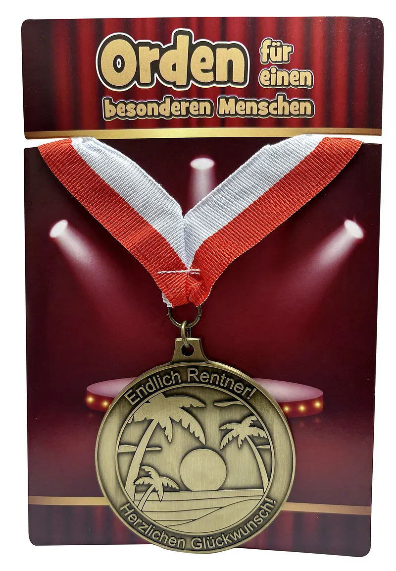 Endlich Rentner, herzlichen GlückwunschOrden für einen besonderen MenschenMedaille aus Metall, auf GlückwunschkarteGrösse: 6,5 cm
