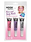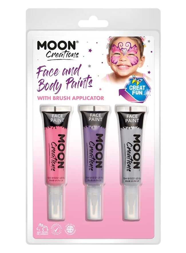 Moon Creations - Face and Body Paints Gesichts- und Körpermakeup-Farbe 3 x 15ml Farben: pink, violett, grau mit Pinselapplikator Made in the UK, wasserbasis, 100% Vegan, ohne Tierversuche.
