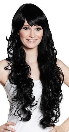 Schwarze Langhaarperücke mit Locken und Pony.