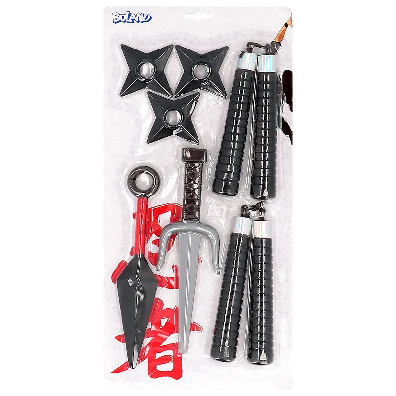 Inhalt: Kunai, Dolch, 2 x Nuchaku, 3 x Wurfstern Material: 94% PVC, 6% Polyester Komplette Ninja-Ausrüstung: Mit diesem Ninja-Set mit 7 Spielzeugwaffen haben Kinder alles, was sie für ein episches Ninja-Abenteuer brauchen. Das Set enthält verschiedene Spielzeu...