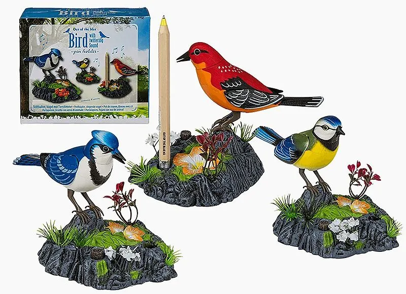 Was für eine schönes Schreibgefühl ! Steckt man den Stift in den Halter, zwitschert der Vogel vergnügt und versetzt einen in Frühlingsstimmung! 3-fach sortiert, Farbe nicht wählbar, kommt nach Lagerverfügbarkeit Grösse: ca. 17,5 cm, aus Kunststoff Batterien (3...