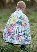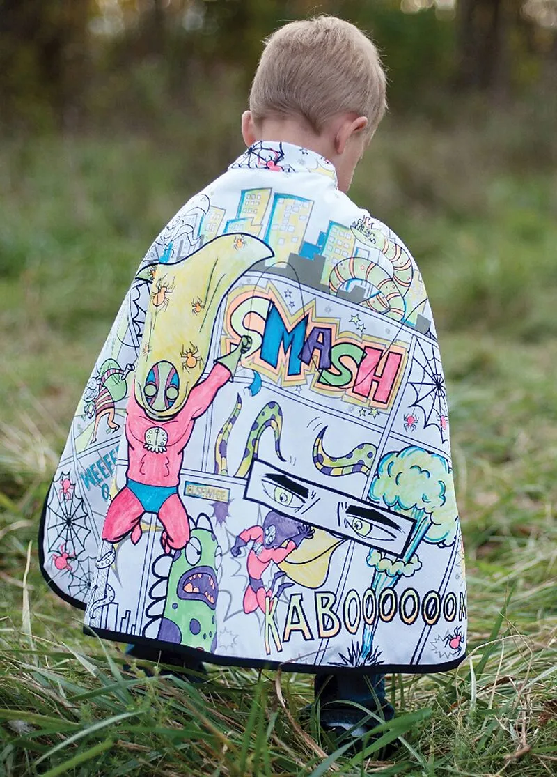 Jeder Held braucht ein Cape! Die eine Seite ist bedruckt mit Spinnennetz und auf der anderen Seite kann man die Seite bemalen, wie es einem beliebt. 60 x 88 x 1 cm Empfohlenes Alter: 4 - 7 Jahre mit 6 Stifte