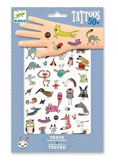 Zwei Bögen mit temporären Tattoos, auf denen es von lustigen und schelmischen Tieren wimmelt! Sie sind leicht anzuwenden, vorgestanzt und können mit ein wenig Wasser aufgebracht werden. Dermatologisch getestet.