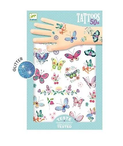 Zwei Bögen mit temporären Tattoos in zarten Farben, leicht und glitzernd wie Traum-Schmetterlinge! Die vorgeschnittenen Tattoos sind einfach anzuwenden und werden mit etwas Wasser aufgetragen. Dermatologisch getestet.