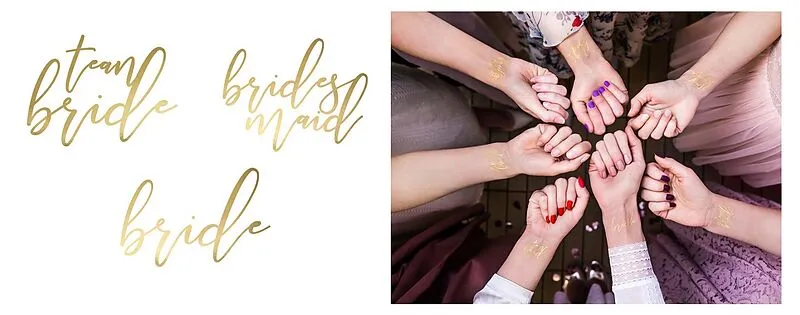 Lieferumfang: Braut (2 Stück), Brautjungfer (2 Stück), Teambraut (11 Stück) Farbe: Gold Temporäre Tattoos für Junggesellenabschied