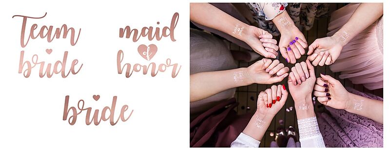 Lieferumfang: Braut (2 Stück), Trauzeugin (2 Stück), Teambraut (9 Stück) Farbe: Rosé Temporäre Tattoos für Junggesellenabschied