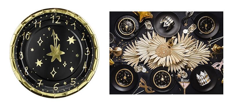 Pappteller Uhr in schwarzer Farbe mit Golddruck, Größe ca. 18cm.