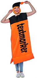 Lange, neon-orangene Robe in Form eines Markierstiftes. Die Schulterpartie und die Aufschrift "Textmarker" sind in Schwarz gehalten. Inklusive einer schwarzen Mütze mit farblich passender Spitze.