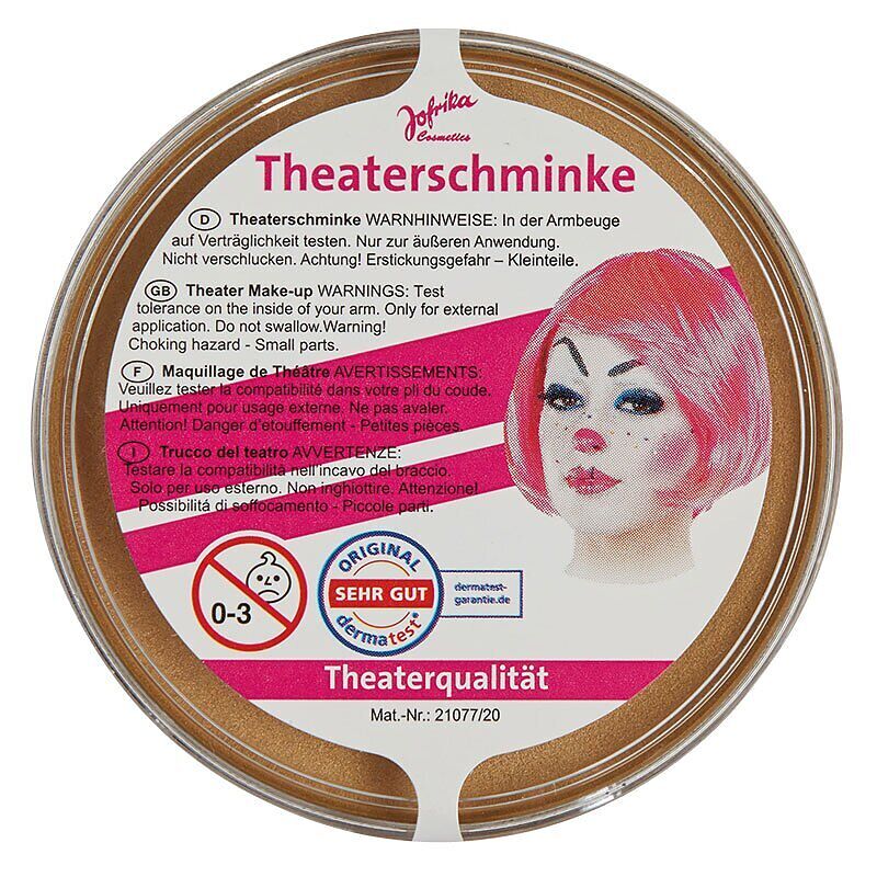 Goldene Theaterschminke mit hoher Deckkraft, die sehr ergiebig ist und sich gut auf der Haut verteilen lässt. Die Schminke wird einfach mit den Fingern, einem Pinsel oder einem Schwämmchen aufgetragen und kann mit Wasser und Seife oder hautfreundlicher Abschmi...