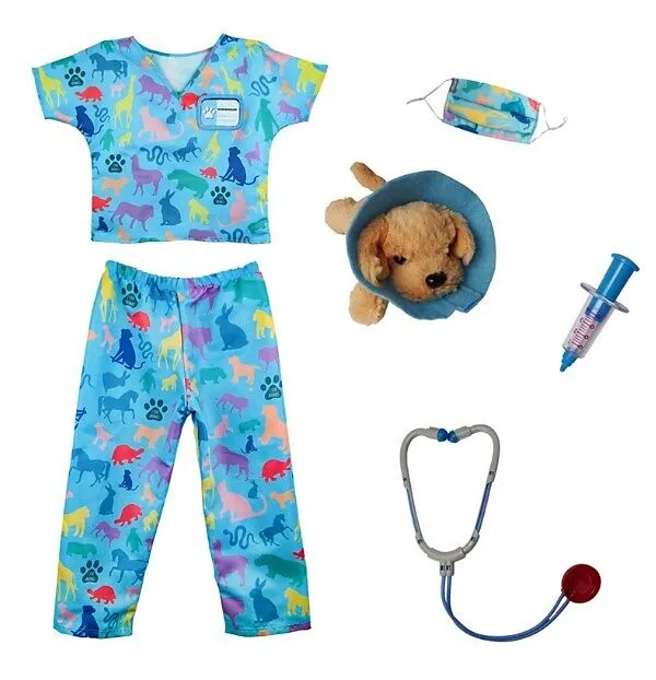 Lieferumfang:Shirt, Hose, Maske, Hund Plüschtier, Stethoskop, Namenskarte, Spritzeempfohlenes Alter: 5 - 6 Jahre